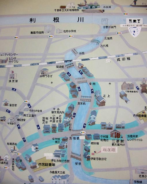 1![]() 「佐原の街並」と題する市中観光案内板の文中には、次のような一節が記されている。 「利根川 [撮影年月日・場所: 2019年8月8日/茨城県佐原市内を流れる小野川沿いにて/伊能忠敬旧邸付近/下図参照]