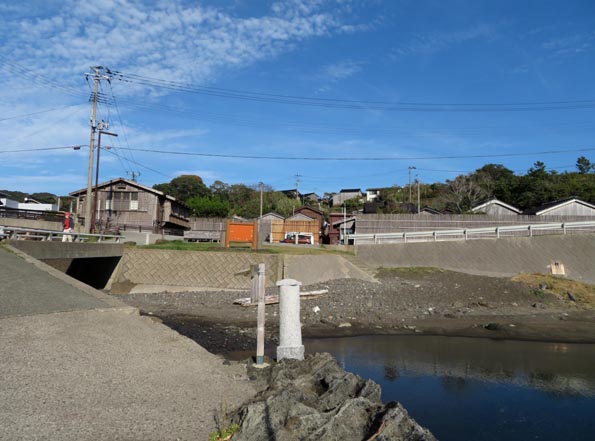 係船柱「船つなぎ石」がぽつんと建っている。宿根木の人はそれを「シロボウズ」とも言う。