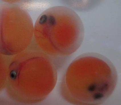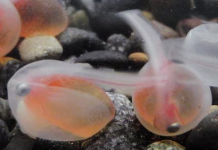 外に出てくる。このようになるまでの積算温度は480度ほどである。生まれたばかりの仔魚は弱く、直射日光に長時間当たると