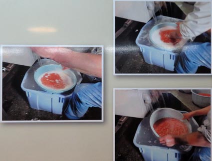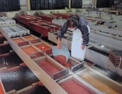 6. 収容: 綺麗に洗浄した卵は吸水させてから、静かにふ化槽へ収容される。卵に直射日光や紫外線が当たらないよう、