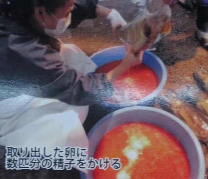 3. 採卵・授精: 雌サケの腹を包丁で切り開き、卵を傷つけないよう慎重に取り出す。この採卵の仕方を