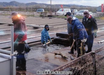 2![]() | 2. 蓄養(ちくよう): 捕獲された雌サケを成熟魚と未成熟魚に分け、後者については成熟 するまで数日間蓄養され、その後に採卵が行われる。 |