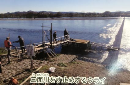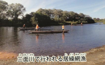 1-1![]() 1-2 | 1. 捕獲: 三面川で行われる漁としては、主にウライ漁(左画像1-1; 川幅一杯に簀止めする「ウライ」を設置し、 ここに「落とし柵」を設けて捕まえる漁法)である。その他、居繰網漁(いぐりあみりょう; 左画像1-2)、刺網漁、 テンカラ漁によって捕獲される。 |