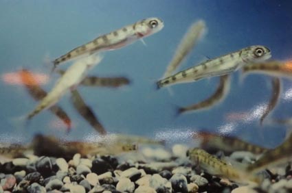| 10. 飼育: 浮上(さいのうが完全に吸収される)したら餌付けを始める。放流までの約2ヶ月間、餌付けをする。 餌付けが進むと水の汚れがひどくなってくるので、通水を良くして環境を綺麗に保ちながら、稚魚の育成に務める。 |