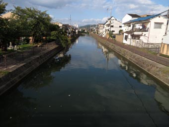 6 7![]() 6. インクラインの下流側の船溜まり(下溜め、下ダム, lower basin)へ、放流水が暗渠の吐き口から流れ出ている(地図「F」)。 [拡大画像: x28809.jpg] 7. 運河の下流側を望む(地図「G」)。運河・第2疏水は、「濠川(ごうがわ・ほりかわ)」となって、伏見港水域・三栖閘門を経て、 宇治川へと注ぎ出る。