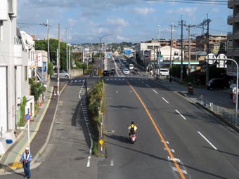 5. 国道24号線の側道(画面左の細道・支道)の上方に、H型をした2階建て鉄骨構造物が見える。