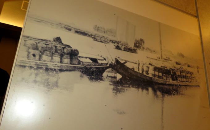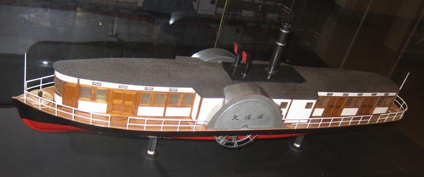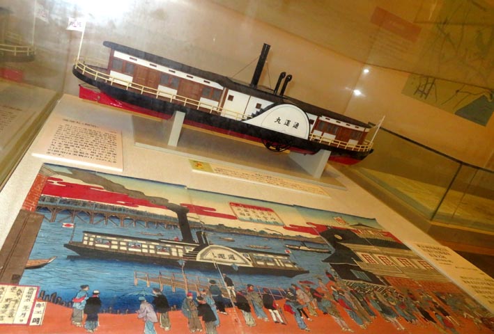 「通運丸」模型と「川蒸気往復盛栄真景之図」(歌川重清・画)