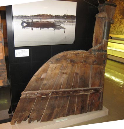 2![]() 「夫婦船頭(めおとせんどう)/茨城県河内村(かわちむら)・昭和32年撮影・個人蔵」と題する高瀬舟の写真である。 キャプションによれば、「河内村(現河内町)金江津地先の利根川本流を棹で遡っています。脇の 下に棹をあてがいながら、舳先から艫方向へとコベリを伝い歩き、舟を推し進めてます。この船は空荷 状態で、先端のオモテタテイタが全て水上に出ています。高瀬船はそれほど軽く浮力がありました」と記されている。