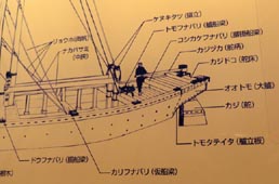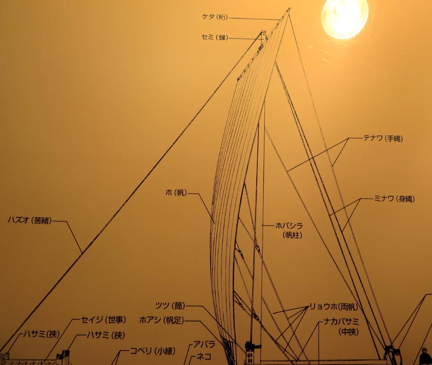 千葉県立関宿博物館には、利根川水系における大型の高瀬舟の模型が展示される。画像はその舟の構造図で、その主要構造部位や艤装などの名称が