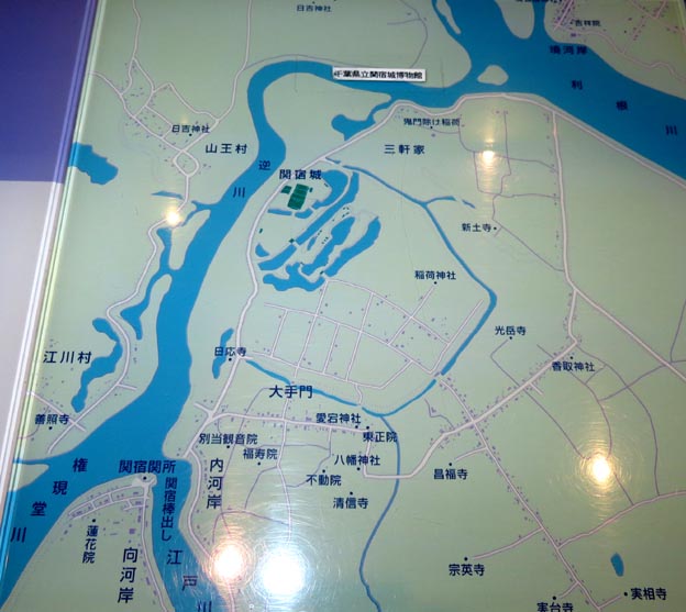 因みに、画像1では、江戸川が右上端から下方へ流れ、棒出し(両岸が突き出したところ)を通って下辺方向へ流れる。 左上端からは、権現堂川(ごんげんどうがわ)が江戸川に合流している。画像右上端を上方(北方)へ辿ると、江戸川の流頭部 となり、利根川に合流する。 画像1・2の棒出しの左岸に建つお堂のような大きな建物が「関宿関所」である。関所(水番所)は関宿の向河岸(むこうがし)にあった。関所では役人が 通行する船の荷物や人を検査した。通行できる時間が指定され、午前6時から午後6時までであった。それ以外の時間に通行すれば関所破り として厳罰に処せられた。また、「入り鉄砲出女(いりでっぽうでおんな)」を厳しく取り締まった。 関宿城は、江戸時代に、右岸の棒出しと利根川・江戸川合流点との中ほどに建てられた。また、利根川の対岸には境河岸(さかいがし)があった。 境河岸や関宿向河岸も関宿藩領であった。二つの河岸は船問屋、倉庫蔵などが立ち並び大いに賑わっていた。