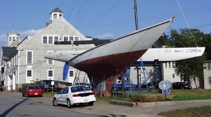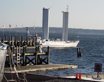 博物館前の地先にヨットハーバーが広がる。 その桟橋に係留されていた、わゆる「ロータリー船」とおぼしきめずらしい最新鋭大型ヨット。 帆はカンバスや化繊ではない。スチールかアルミ製であろうか? 風向に応じて「帆」の角度が操作される。 「帆」は、飛行機の翼と同じ原理で、前進の推力をつくりだす。 翼の場合は垂直方向であるが、この「帆」の場合は水平方向の推力をつくりだす。 要は、翼を垂直にしたのと同じである。