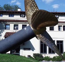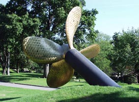 ![]() 博物館前庭に展示された巨大なスクリュー [拡大画像(x4915.jpg)] WW II Troopship Propellaer: Diameter-20 feet 6 inches, Weight-19 tons.