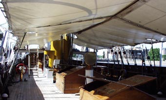 [右画像 1: 「ウ」号後方部甲板から船体中央部を臨む。天幕]/その超拡大画→