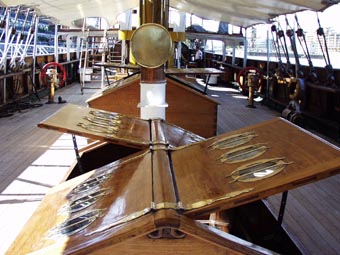 [右画像 2: 「ウ」号後方部甲板から船体中央部を臨む。通風と明かり取りを兼ねた