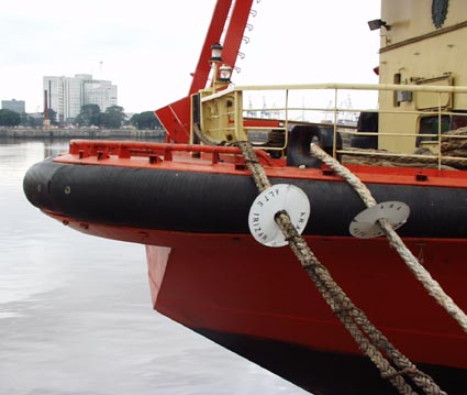 円盤形のラットガード、甲板上に張られた安全ネットがよく見える. |