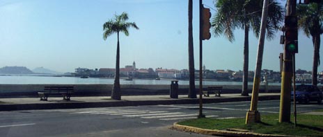 1. パナマ湾岸沿いに走る「バルボア大通り(Avenida Balboa)」から旧市街地の「カスコ・ビエッホ」を遠望する。左手に小山が見えるが、旧市街地