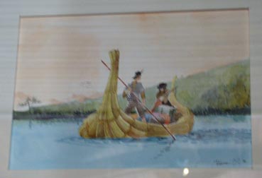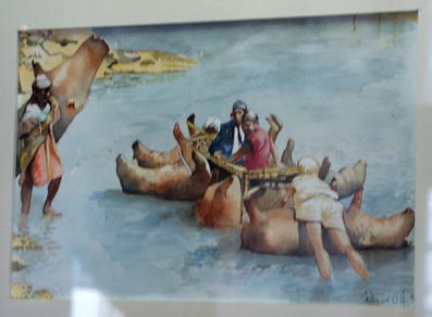 2- 動物の皮でできた水上運搬手段を描いた水彩画