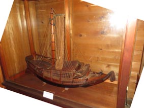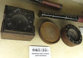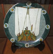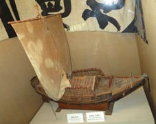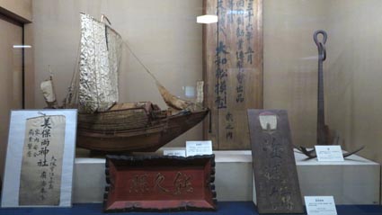 2 3![]() 1. 船模型「永融丸(えいゆうまる)」。橋立の北前船主・西谷家の持ち船。 2. 酒谷家の印半纏。 3. 「色絵九谷北前船図大皿」(寄贈:北村隆氏)。