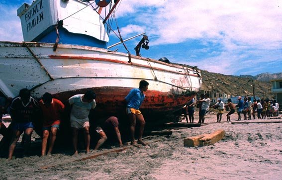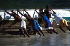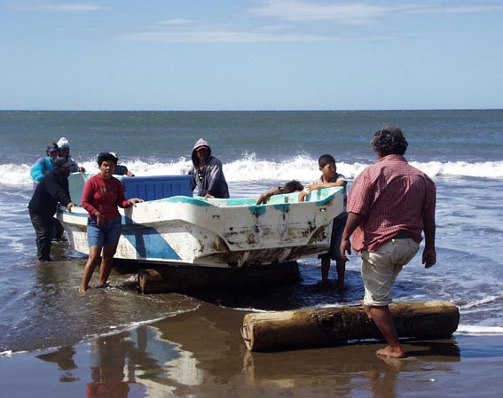 中米ニカラグア太平洋岸の漁村風景 [3]/ボートの浜上げ