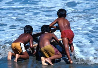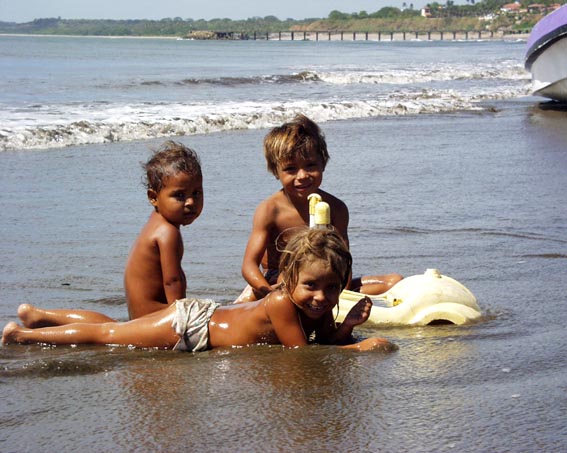 中米ニカラグア太平洋岸の海辺にて [4]/渚で戯れる幼子三人