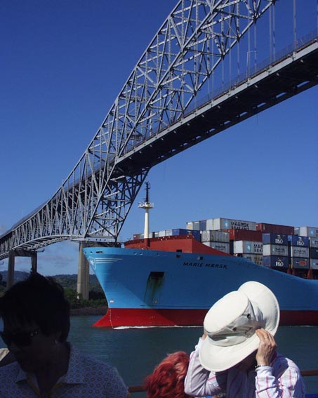 パナマ運河を通過し、ラス・アメリカス橋をくぐり、太平洋に出るコンテナ船 [中米・パナマ]