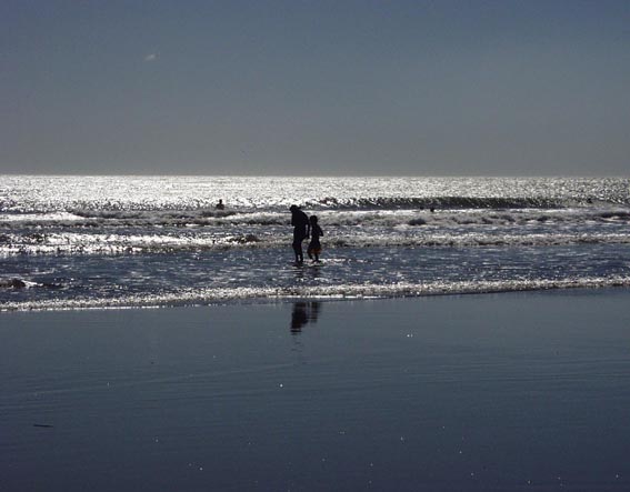 中米ニカラグア太平洋岸の漁村風景 [9]/波打ち際を散歩する親子