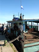 岸壁に接岸した小型船の乗組員がのんびりと客を待つ。朝8時頃の港風景である。