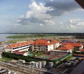 プノンペン市街の「カンボジアーナ」ホテルの屋上から大河川の十字路を見た。