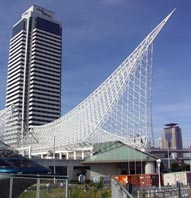1&2. [拡大画像(x18478.jpg)][拡大画像(x18481.jpg)] 中突堤中央ターミナル「かもめりあ」から見たポートタワーと 遊覧船発着桟橋 3. [拡大画像(x18479.jpg)] ポートタワーの東側に広がるメリケンパーク内の神戸海洋博物館 4. [拡大画像(x18510.jpg)] 1963年建設されたポートタワーの画像[神戸海洋博物館内の特別展示「カワサキワールド」]