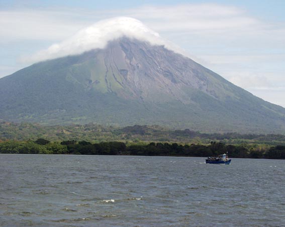 頂上を笠雲に覆われたこの山はコンセプション火山で、標高1610m。もう一つの山はマデーラ火山、標高1394m。
