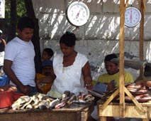椰子の葉っぱでふいただけの、まさに直射日光を遮蔽するだけの覆いの下で、陽気に商いをしている。