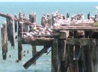 旧桟橋の一部が崩れ落ちそのまま取り残され、海鳥たちのかっこうの棲みかになっている。
