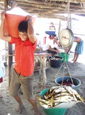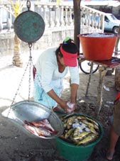 浜で獲れたての鮮魚を売る人たち。さきほど水揚げされたばかり。新鮮そのもののである。これらの魚は