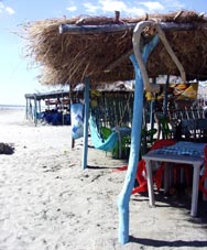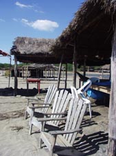 海辺に出てみるといろいろな夏の風景に出会う。椰子の葉っぱで造られた海の家、主人がいない古びた椅子が鎮座する。