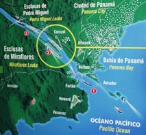 1. ミラ・フローレス閘門はちょうど円形内に位置する。その円形内に記された灯台マークが画像の導灯である。