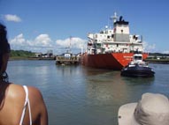 1. 画像には写っていないが、右舷に配置されたタグボートの操作でゆっくりとミラ・フローレス閘門のアプローチ