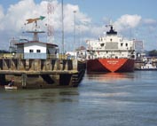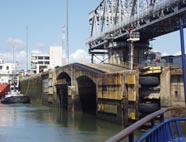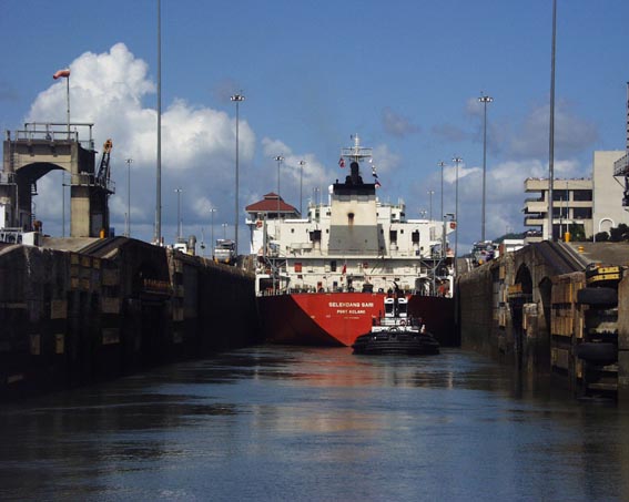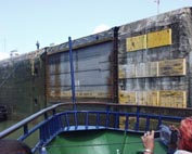 ミラ・フローレス閘門の第一チャンバー(閘室)にすっぽりと巨体がおさまった。