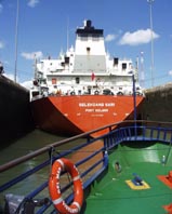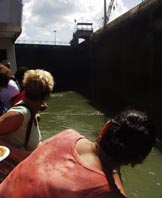 ミラ・フローレス閘門の第一チャンバーに入った巨大タンカーとわれわれの遊覧船は、第2チャンバーの