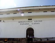 威容を誇る閘門制御棟。側面には「Miraflores 1913」と記されている。