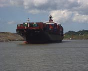 前方には、大型コンテナー船が、ヘビのようにくねったクレブラ・カットを通過中である。