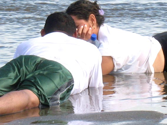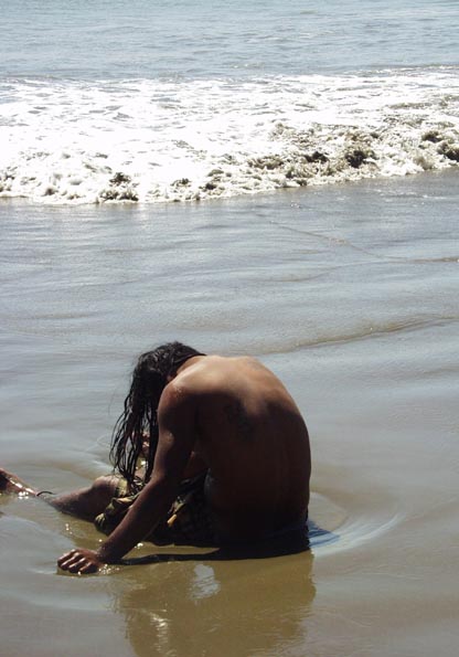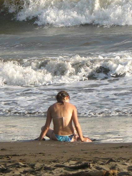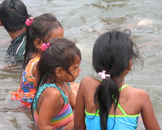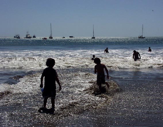 渚で波と戯れる幼子三人 [中米ニカラグア]