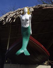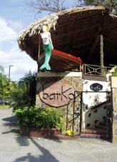 椰子の葉っぱで葺いた、あるレストランの入り口に小ボートの船首が軒下にセットされている。