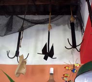 レストランのあちこちの軒下に、四爪アンカーがこんな具合にデコレーションとして吊り下げられている。