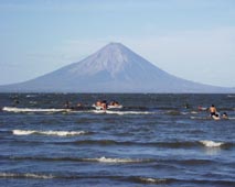 すること約2時間。やがて左手に中米で最大のニカラグア湖(淡水湖。淡水サメが棲息するとのこと)に浮かぶオメテペ島の火山が見えてくる。