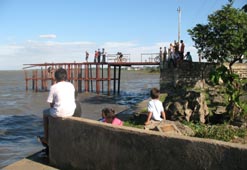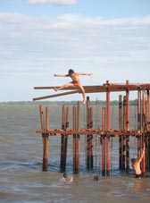 その一角に崩れた桟橋のような出っ張りがある。少年たちが茶色く濁った湖水面をめがけて飛び込んでいた。