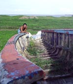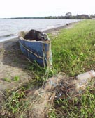 4. 湖畔の木製小舟。漁網が傍らにあることからしてまだ現役使用にあるらしい。