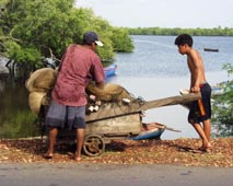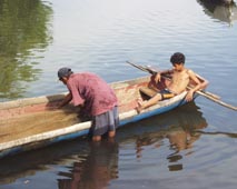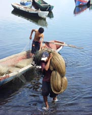 子供は何もしないでカヌーの艫(とも)にだらしなく横たわっている。そして、親が黙々と網整理するのをただ呆然と