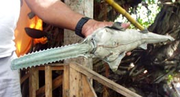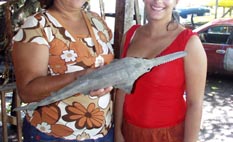 であった。このニカラグア湖(淡水)で捕れたサメのものだという。さらに、家の奥からノコギリ鮫の剥製をもちだして来て