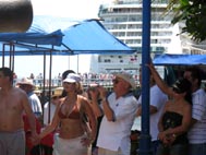 巨大な海洋構造物から大勢の観光客らがはきだされる。桟橋は余りにも長いので脚に自信のない老人たちは