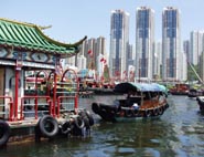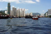 漁船の碇泊風景は壮観である。狭水路の対面の小島側岸沿いには高層住宅ビル群が林立する。アバディーン(香港島)側と